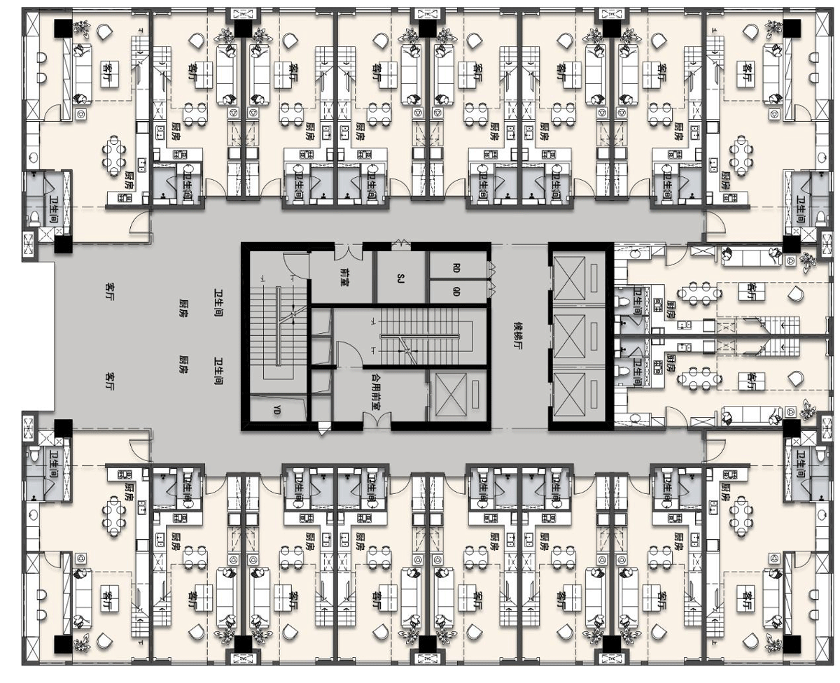 将板式塔楼分隔成竖向体块,并进行横向的划分,使形体更加均衡。增加横向铝板线条,深化形体。增加宽细线条的对比,使其交错均衡的分布在立面上。