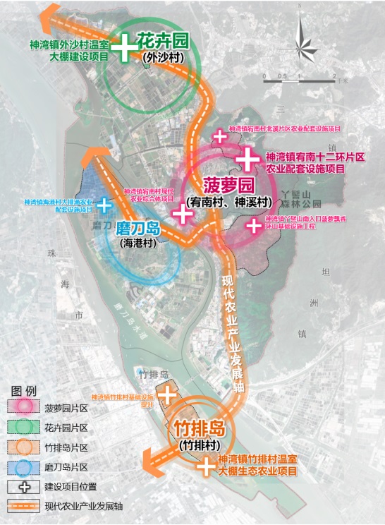 项目总投资约3亿,现代农业示范园形成“一链双核,双园双岛,轴带串联”的总体布局,包括一链即咸淡水特色水产养殖链,双核即花卉产业、菠萝产业,并通过现代农业产业发展轴整体串联。发展轴以神湾大道-外沙工业大道为轴线,串联现代花卉育种示范园(外沙村)、农文旅融合发展示范园(宥南村、神溪村)、磨刀岛循环种养示范园(海港村)、咸淡水特色水产养殖示范园(竹排村)等四大农业产业片区,集成智慧农业管理系统与冷链物流网络,形成种苗繁育-标准化种植-精深加工-品牌营销的产业闭环。