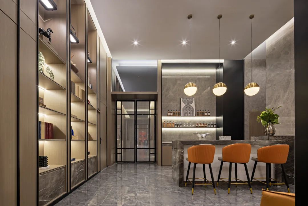 设计师将架空层打造成休闲的城市客厅,通过休闲区、自动售卖机、书吧区、绿植墙等设施的打造来提升居住者的幸福感。柔和的米色、啡色、金属色为主调,营造温暖舒展的空间氛围,凸显低调奢华的气派。