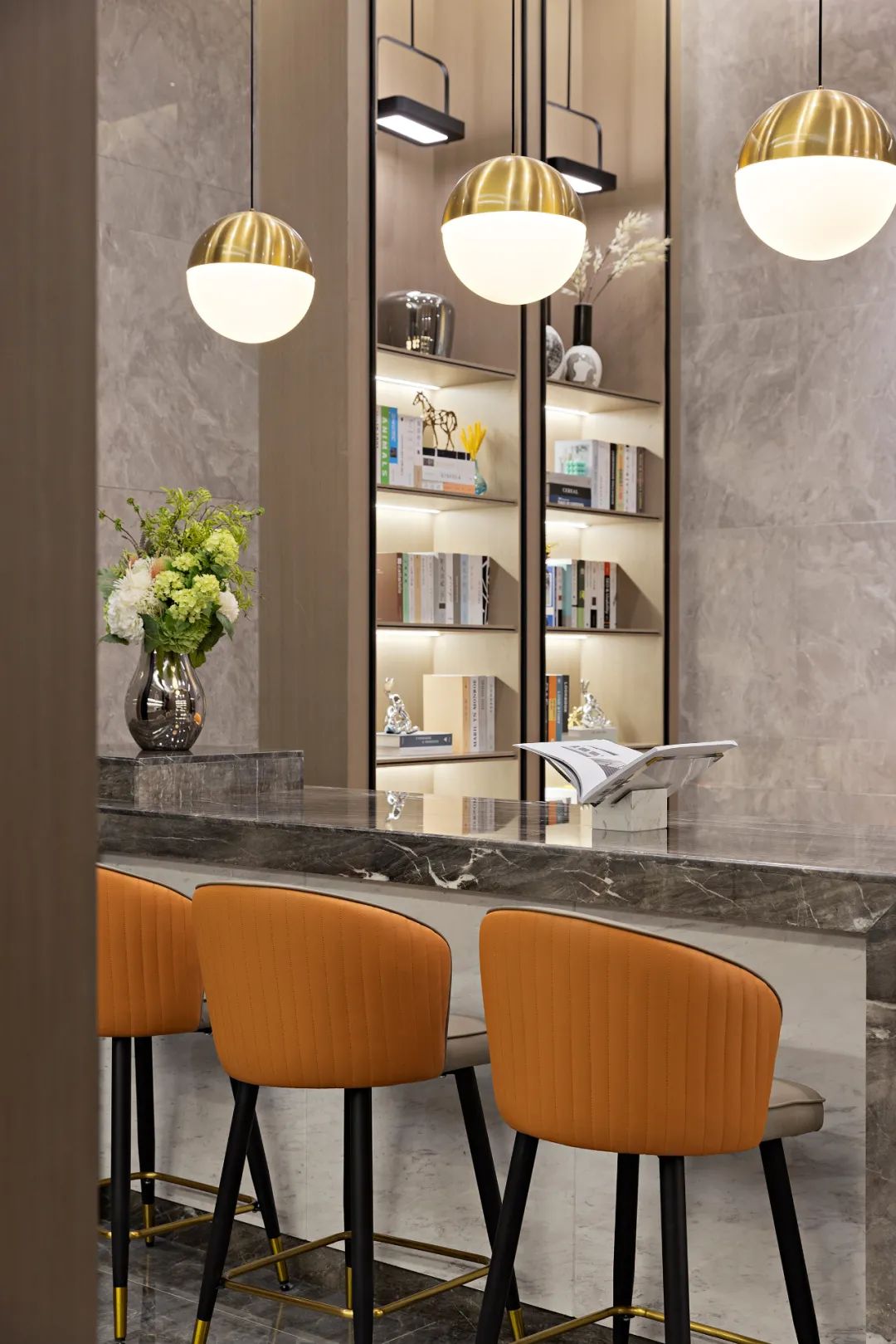 巧用售楼部层高,采用双层叠加的方式,让空间更有秩序感和造型感。而石材柱子造型,让空间变得更有气质和力量感。