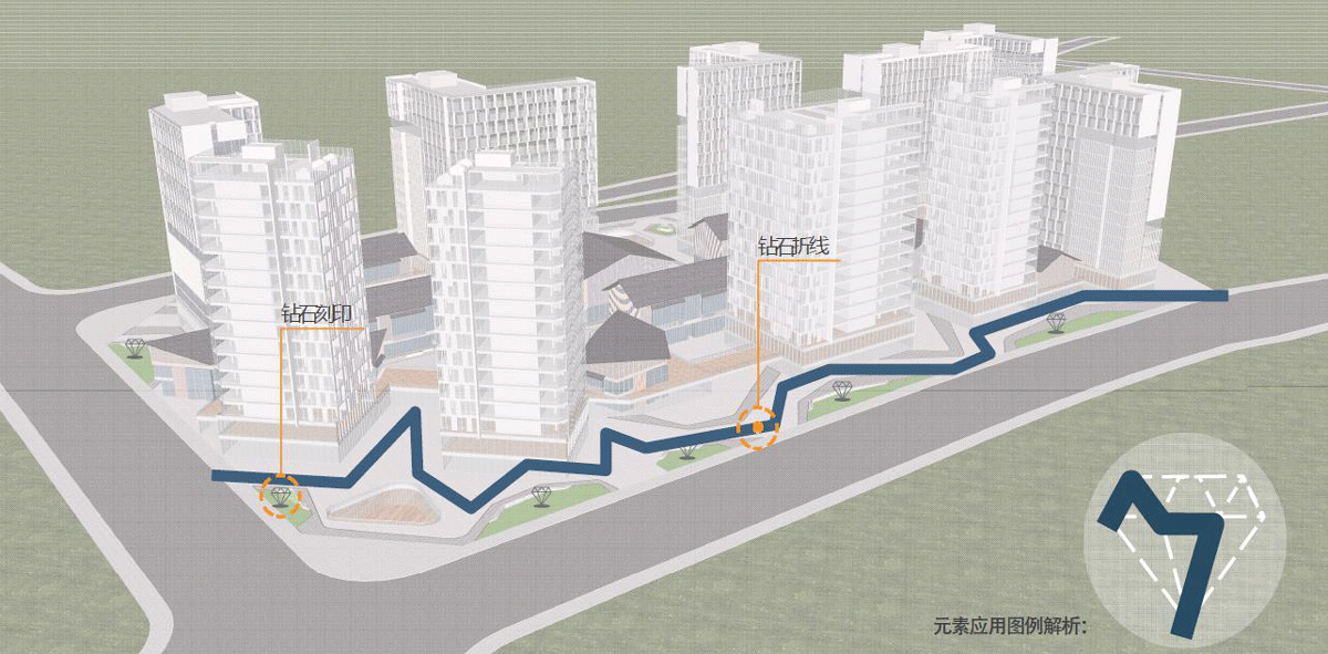 本次景观设计以“永恒”为方案主题概念,提取“钻石”为主要设计元素。并将“钻石”刻印在本次设计方案中,串联整个商业街道,从而达到一种“璀璨”“永恒”的商业广场隐喻效果。